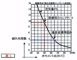 はコンクリートの水量と耐久性の関係を示すものですが、水量を減らせば耐久性は著しく高くなることを示しています。